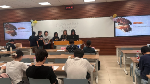 随后,十二个小组依次登场,围绕成都糖画、蜀锦、川剧、二十四节气、画蜡、宁波彩漆等非遗项目展开英文推介汇报。各小组借助精心制作的PPT,从历史沿革、文化价值、技艺特征等角度,用地道的英语生动诠释非遗魅力。介绍成都糖画的小组,详解其制作工艺的同时,还讲述了背后的民俗故事;聚焦川剧的小组则深入解析变脸技艺的艺术表达与文化内涵,精彩汇报引发阵阵掌声。每一组的英文汇报都各有千秋,PPT里的非遗纹样与同学们的流利表达相映成趣,让这场实践活动成了文化传播的“舞台”。