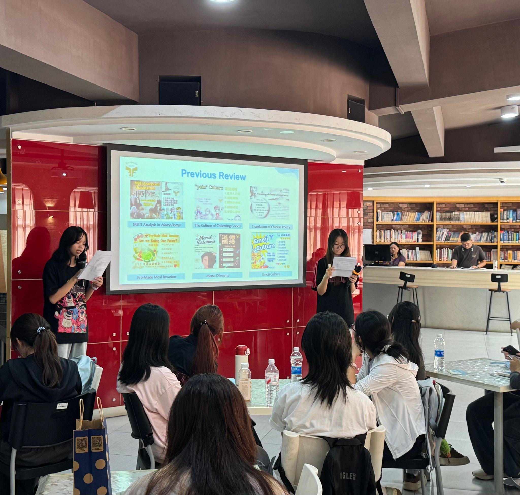 活动伊始,主持人通过展示上一学年英语角活动的照片、海报等素材,带领大家回顾了往期 “E-chody” 英语角的精彩瞬间,同时生动介绍了 “E-chody” 的核心概念,以及 “哪吒国产动画文化探讨”“AI 裁判公平性辩论” 等往期代表性活动主题。这些瞬间勾起了同学们的活动记忆,为整场活动奠定了温暖且充满期待的交流基调。