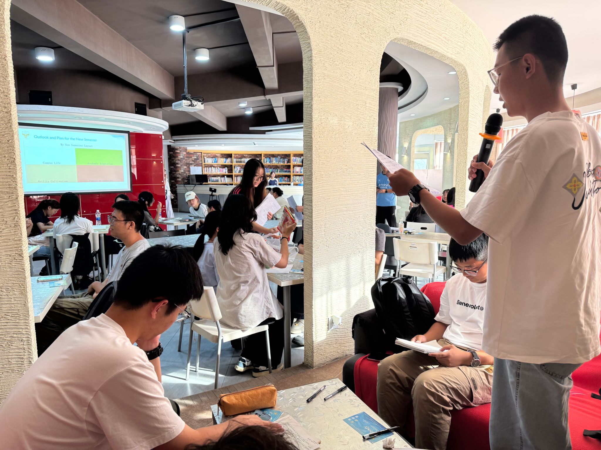 随后,活动进入小组讨论环节,同学们以 4-5 人为一组,围绕 “往期最难忘的英语角活动”“新学年对英语角的改进建议”“期待的互动模式”和“希望开展的活动主题” 四个核心问题展开热烈探讨。大家各抒己见,积极分享对过往活动的深刻感悟与对新学年的美好憧憬。讨论结束后,多个小组代表踊跃上台,向全场同学分享组内的精彩观点,现场交流氛围持续升温。