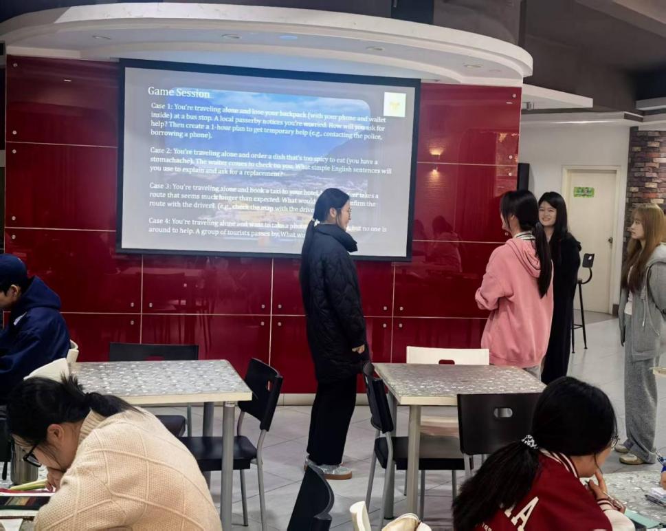 本次活动的亮点环节为情景模拟游戏,主持人设置了四个高度还原的旅行场景:丢失含手机与钱包的背包、点餐时因食物过辣引发肠胃不适、出租车司机疑似绕路、需向陌生游客求助拍照。同学们分组抽取场景任务,在规定时间内构思沟通思路、设计英语对话,现场模拟真实沟通情境。大家积极参与、大胆表达,有的小组凭借清晰的逻辑与流利的英语成功 “化解危机”,有的小组则在互动中巧妙应对突发状况,现场笑声与掌声不断。通过 “沉浸式” 实战模拟,同学们在轻松氛围中熟练运用所学表达,有效提升了语言实战能力与应急反应能力。