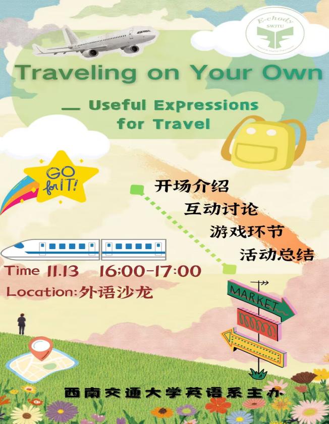 本次 “E-chody” 英语角第十周活动,将英语学习与真实旅行场景深度结合,不仅为同学们提供了锻炼英语口语、积累实用表达的优质平台,更帮助大家储备了独自旅行的应急知识与沟通技巧,为未来的跨文化出行奠定了坚实基础。相信同学们能将本次活动所学灵活运用到实际生活中,持续保持对英语学习的热情,在语言实践中不断提升自我,以自信的表达与从容的心态探索更广阔的世界。