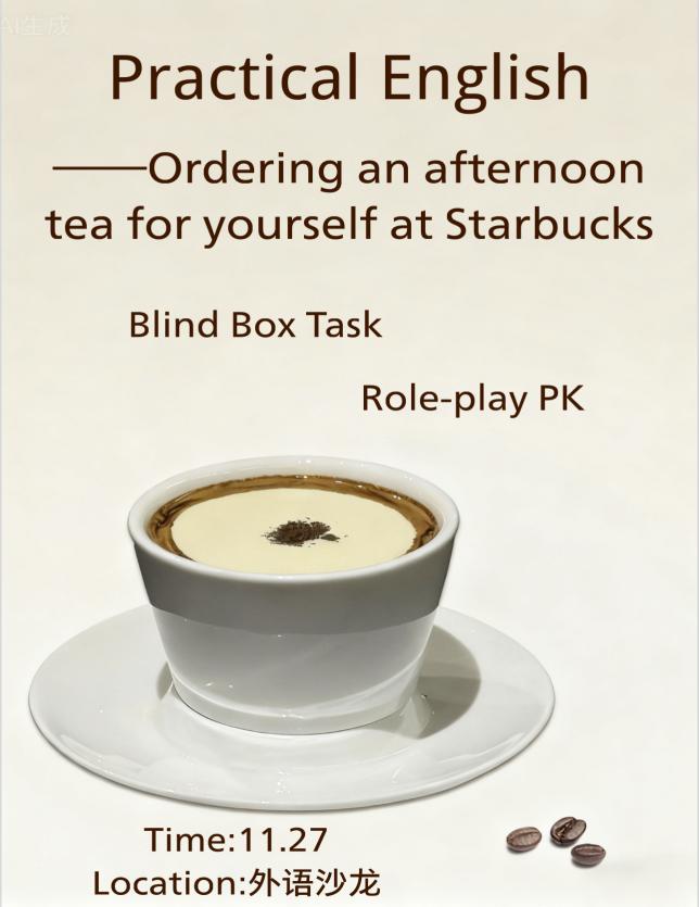 为了进一步提高同学们在日常场景中的英语实用表达能力,丰富星巴克点单等生活场景的口语交流经验,我系以 “Ordering an afternoon tea for yourself at Starbucks(在星巴克为自己点一杯下午茶)” 为主题,于 2025 年 11 月 27 日下午 16:00-17:00 在外语沙龙举办 “E-chody” 英语角第十二周活动。本次活动由 2024 级英语 1 班曾验杰、刘婷婷、代晨璐、胡雨钗、李昕冉、夏雨馨同学及英语角策划组共同策划,吸引了英语系各年级同学积极参与,在趣味学习与实景模拟中提升语言应用能力。