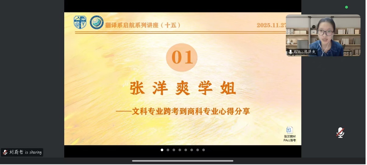 2025年11月27日晚,翻译系本科启航系列讲座第十五期——“译路同行,研途共勉”考研经验分享会于线上顺利举行。本次分享会邀请到翻译系三位2020级优秀毕业生担任主讲,吸引了翻译系和英语系众多有志于深造的学生参与。
