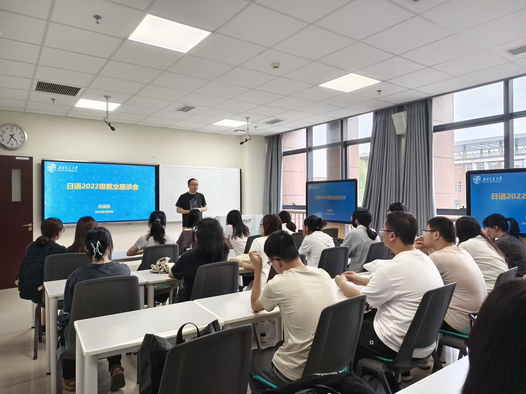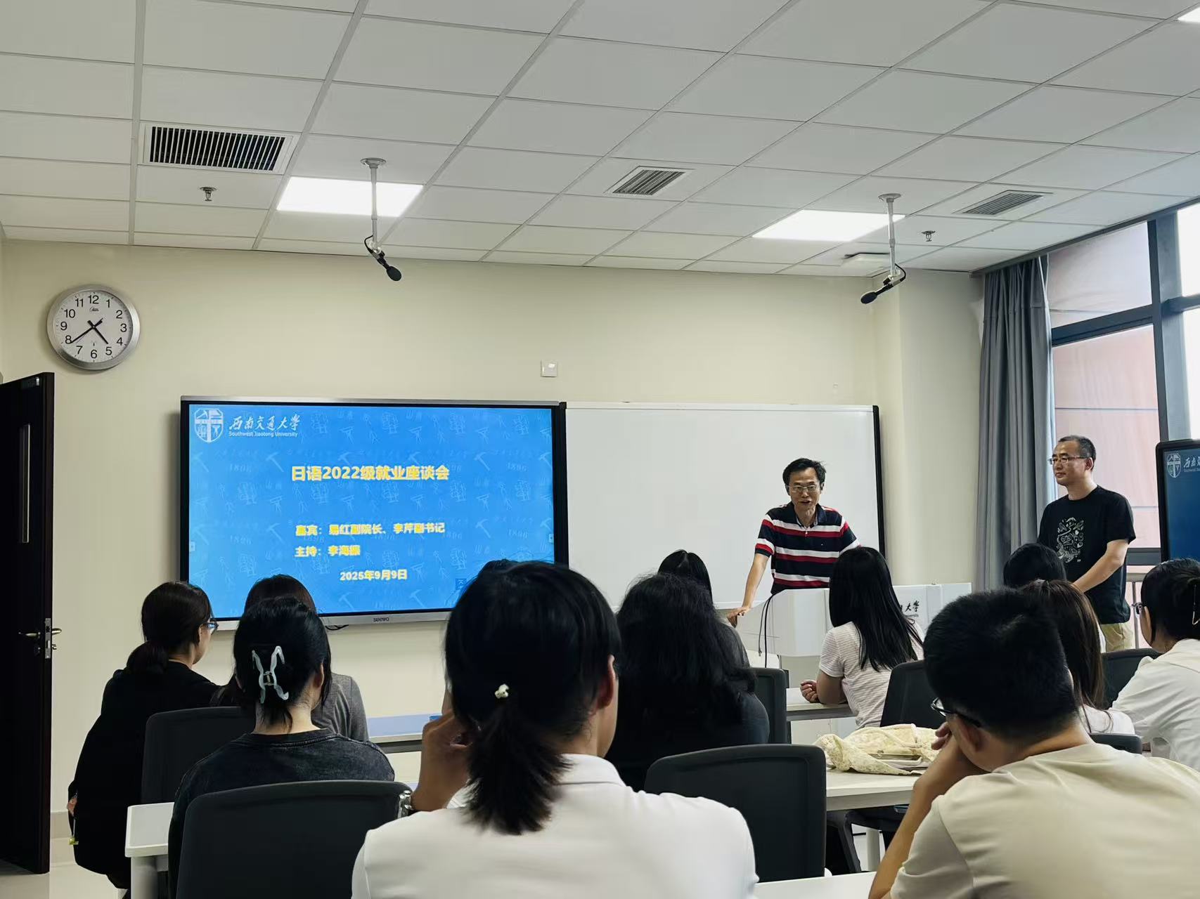2025年9月9日下午,日语系组织2022级全体同学召开了就业专题座谈会。外国语学院副院长易红、党委副书记李芹及辅导员徐玮彬等老师应邀参加,座谈会由李海振老师主持。
