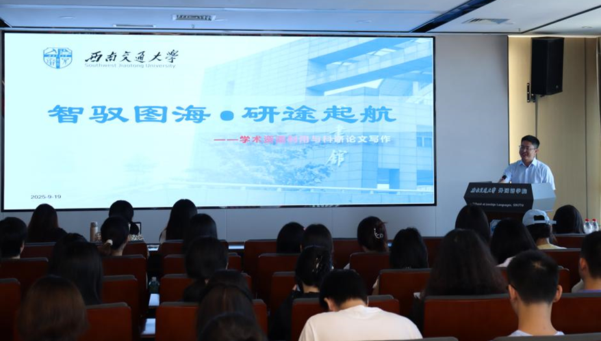 为全面提升研究生新生的信息检索能力,帮助其熟练运用各类学术检索数据库,外国语学院于9月19日下午2点在犀浦校区30820教室开展“智驭图海 研途启航——学术资源的利用与科研论文写作”专题讲座。本次讲座特邀学校图书馆杨勇老师担任主讲人,外国语学院2025级全体研究生参与。