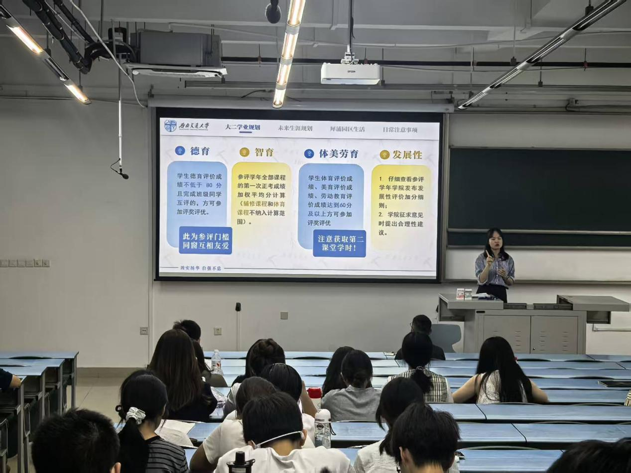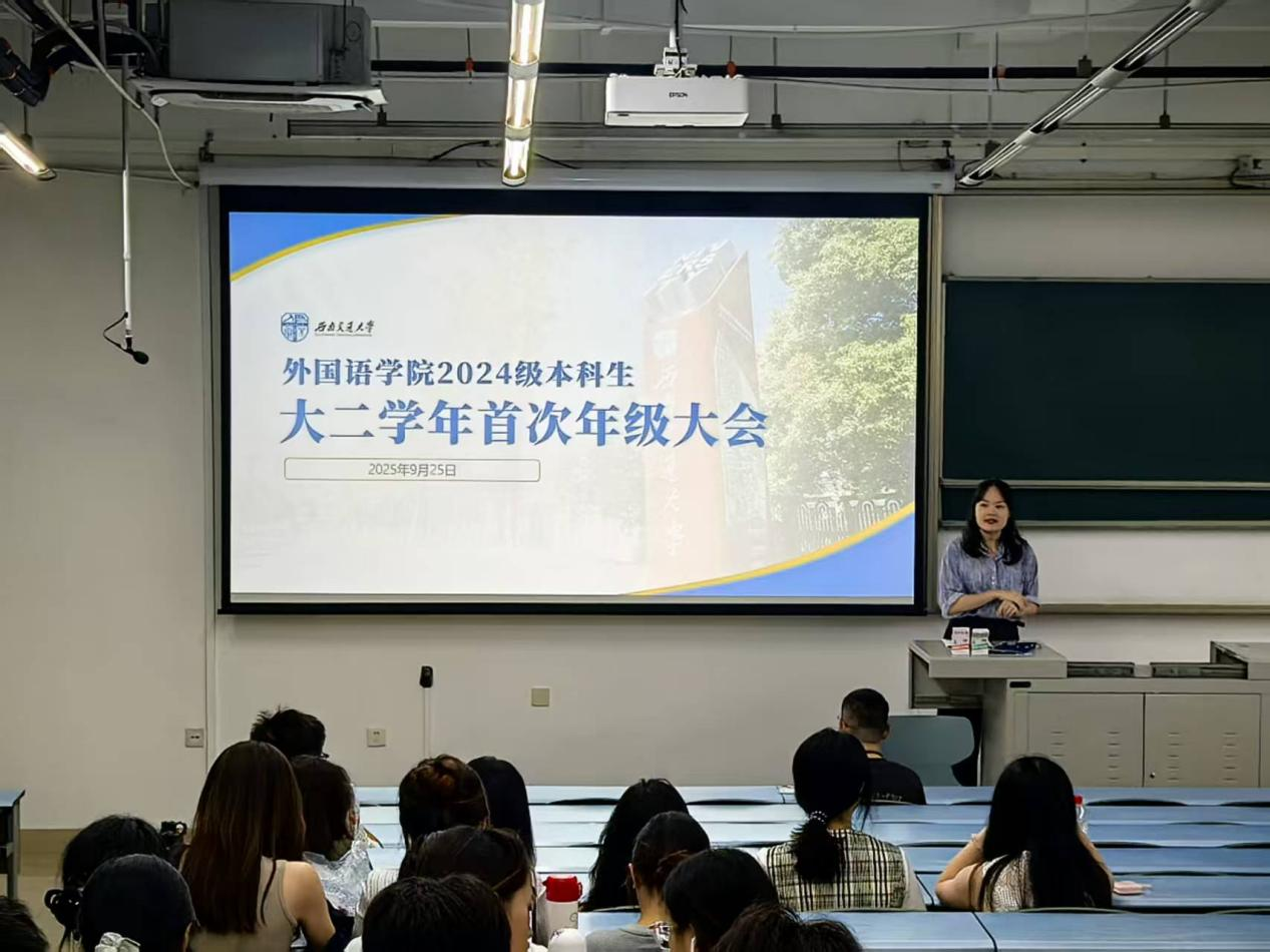 2025年9月25日19时30分,外国语学院2024级本科生2025-2026学年首次年级大会在犀浦校区X2218顺利召开。大会由2024级本科生辅导员赵敏聪老师主持,全体2024级本科生参加。