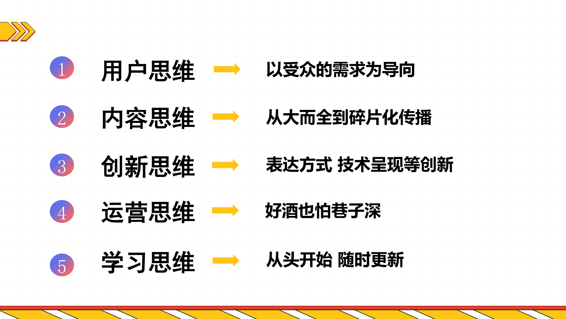 以四川观察融媒账号的实战经验为蓝本,陶主编通过丰富案例系统解析了新媒体运营应具备的五大思维体系,即用户思维、内容思维、创新思维、运营思维、学习思维。其中,用户思维要以受众需求为导向,内容思维要聚焦“暖、牛、巧、趣、美”等互联网用户关注偏好,更好适应碎片化传播;谈到创新思维,她以自己在“高考季”等常规选题的破题思路举例,介绍达成表达与技术双重创新的实战经验;运营思维指的是熟悉平台运营规则、明确账号定位、掌握运营技巧;学习思维则要求新媒体人突破传统思维限制,持续学习以不断深化专业能力。这五大思维相辅相成,共同构筑起新媒体人的核心素养。