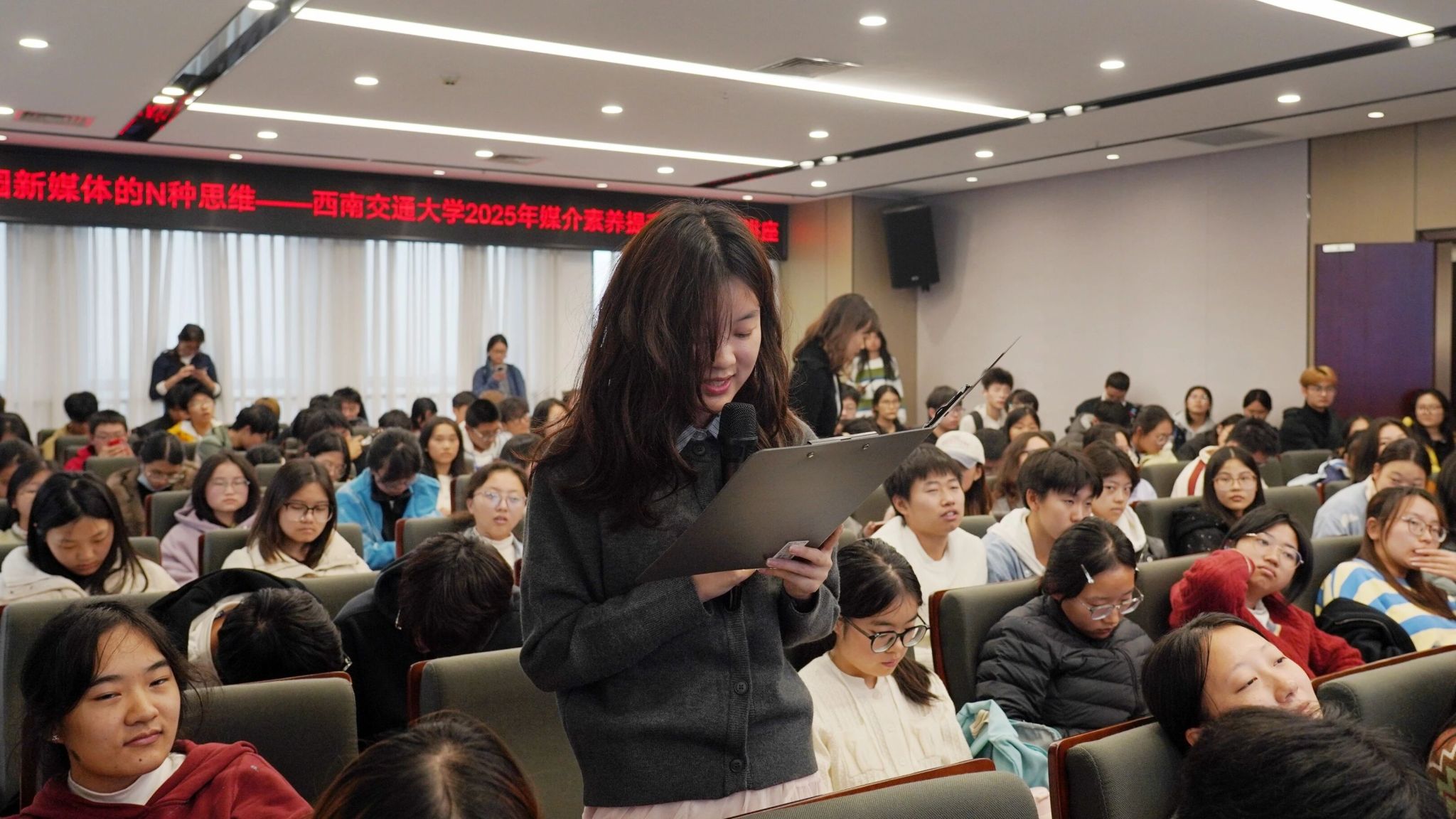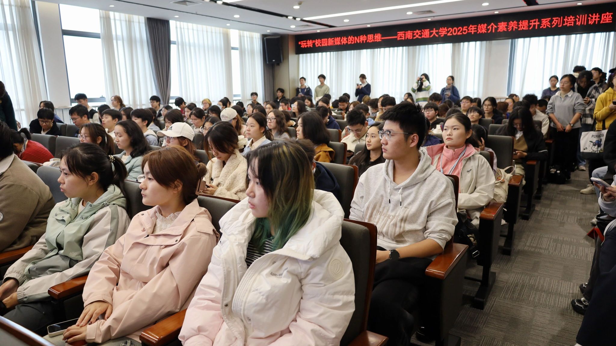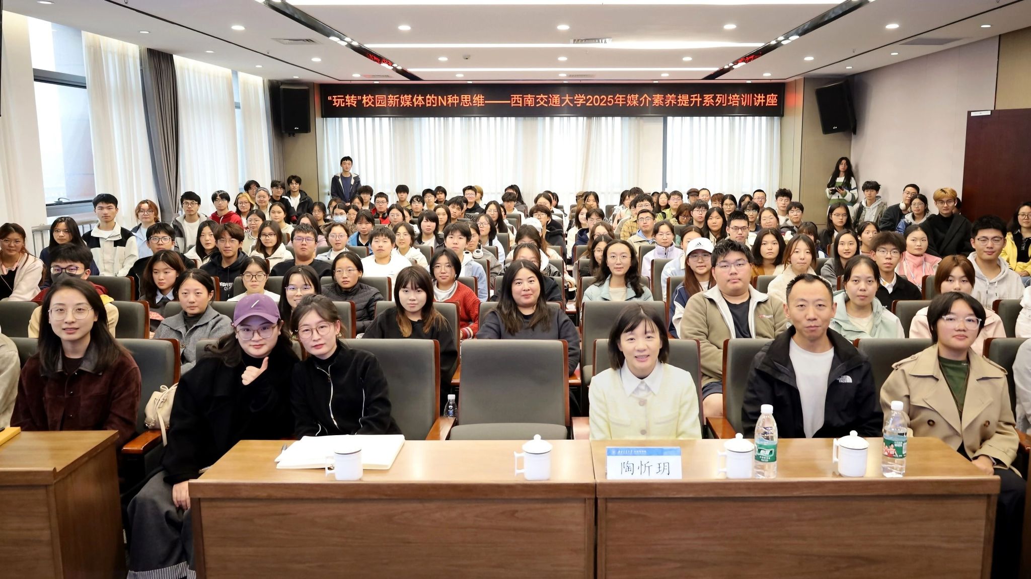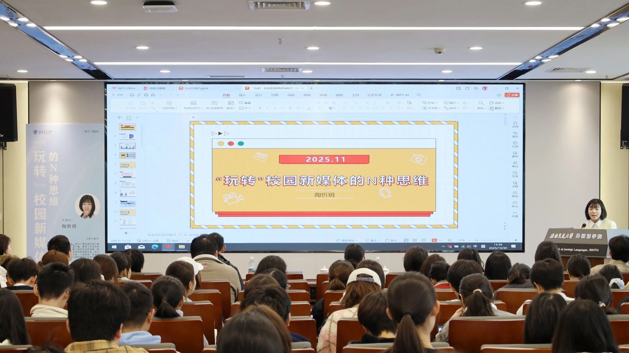 10月30日13:30,四川广播电视台四川观察首屏编播部副主编陶忻玥老师应邀莅临西南交通大学2025年媒介素养提升系列讲座,以“玩转校园新媒体的N种思维”为主题,向小记者们系统性传授融媒体时代校园媒体的发展之道。百余名师生齐聚一堂,现场气氛热烈。本次活动由党委宣传部主办,外国语学院承办。