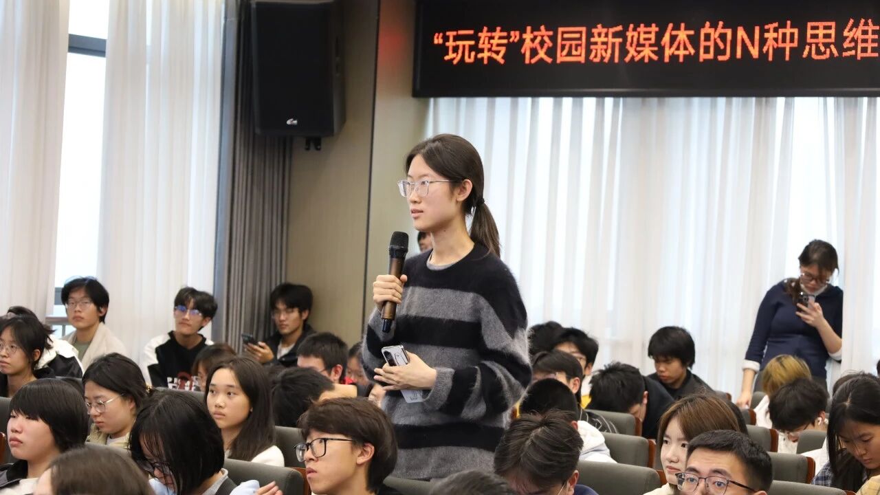 在最后的互动环节中,现场观众踊跃提问,小记者们围绕“如何平衡权威性与年轻化表达”和“如何在采访时深入挖掘有价值的问题”等话题与陶老师展开交流。陶忻玥老师结合自身经历,耐心解答,其回答兼具理论高度与实践意义,为同学们指点迷津。