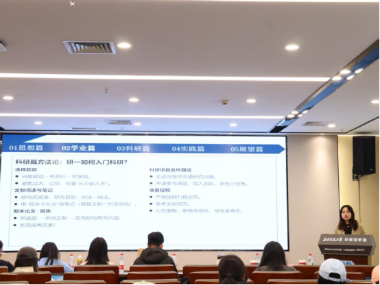 活动中,杜晨溪学姐围绕自身成长经历,从思想、学业、科研、实践、展望五个维度展开分享。作为获评2025年研究生国家奖学金、2025年研究生一等学业奖学金的优秀学子,她不仅分享了CATTI备考、外研社赛事备赛的实用方法,还介绍了参与《古蜀金沙》英译、《柏桦诗歌在海外的译介与接受》著作出版的科研经历,并介绍了入门科研的经验与方法,为同学们在学术与科研领域深耕积累提供了切实可行的参考。