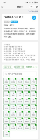本次活动采用“线上精读+线下研讨”双轨模式进行,各支部党员同志共分为五个学习小组。2025年12月10日至16日,同志们围绕红色经典著作,依托微信小程序平台开展为期7天的线上阅读打卡。学员积极分享读书笔记与思考感悟,在持续的理论浸润中夯实思想根基、培养研学习惯。
