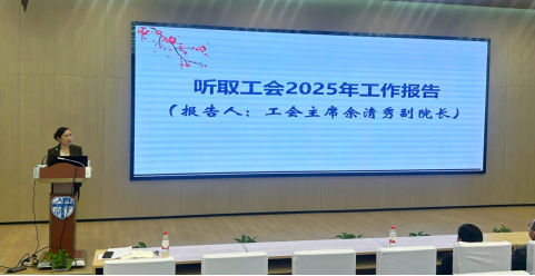 大会还听取了学院工会主席余清秀副院长所作的工会2025年工作报告。报告以《紧扣功能 狠抓“三力”——加强特色建设,讲好外语工会故事》为题,回顾了过去一年院工会在不断增强引领力、组织力、服务力方面的举措。余清秀介绍,院工会通过着力讲好“服务故事”、“教育故事”和“外语故事”,用心用情打造具有外语特色的工会工作品牌,也提出了下一步工作思考。