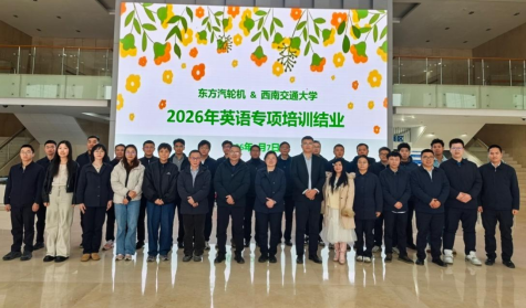 2026年2月7日下午,东方汽轮机-西南交通大学英语专项培训结业典礼在东方汽轮机有限公司(德阳)举行,标志着为期三月的英语专项培训项目圆满收官。东方汽轮机有限公司科技管理部副部长文圆圆、西南交通大学外国语学院院长俞森林教授、学院MTI中心主任戴若愚副教授,培训教师代表陈林老师、班主任陈琳老师,以及25名学员与相关项目支持人员共同出席了典礼。