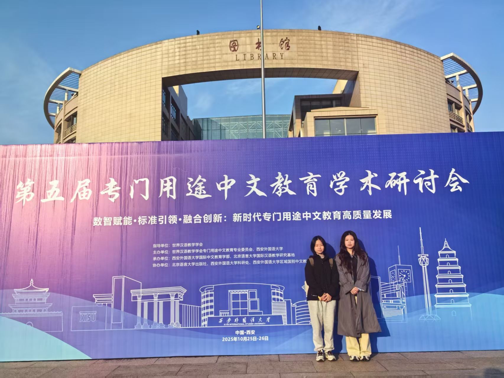 2025年10月25日至26日,以“数智赋能·标准引领·融合创新”为主题的第五届专门用途中文教育学术研讨会在西安外国语大学长安校区隆重举行。本次会议由世界汉语教学学会专门用途中文教育专业委员会与西安外国语大学联合主办,吸引了全国多所高校、科研机构及企业代表参与。西南交通大学外国语学院国际中文教育专业两名研究生高文婧、蒋雪正聚焦于专门用途中文教学案例资源的系统梳理与研究开发,此次全程参会不仅使她们深入了解了领域前沿动态,更通过广泛交流积累了丰富的一手学术资料,为后续参加国际中文教育案例大赛奠定了扎实的资源基础。