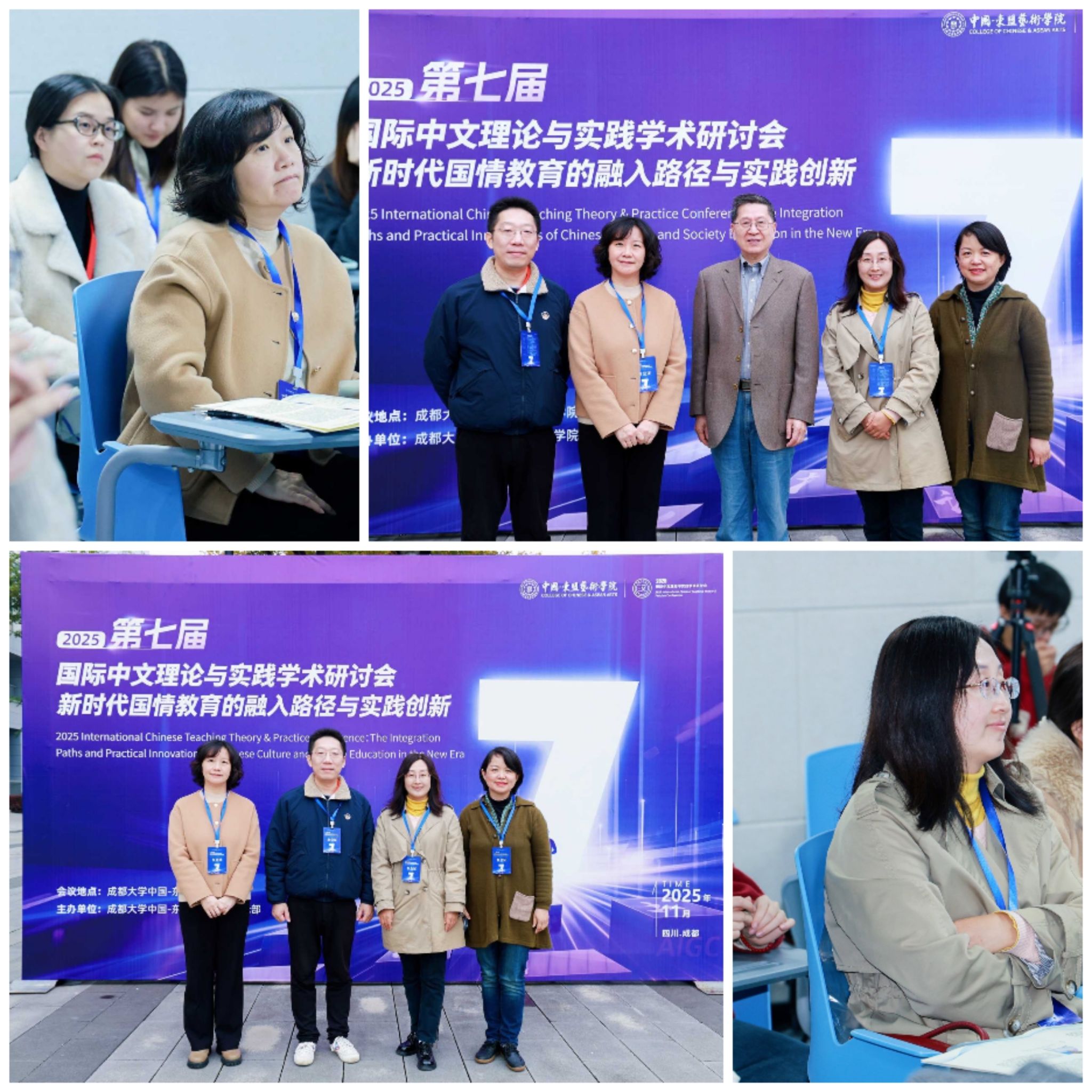 2025年11月1日,第七届“国际中文理论与实践学术研讨会”在成都大学召开。本次会议以“新时代国情教育的融入路径与实践创新”为主题,汇聚了国内国际中文教育领域的专家学者。西南交通大学《中国概况》课程团队成员任显楷、王昕、杨琼、王海玲四位老师积极参与此次盛会,围绕课程建设与教学创新进行了深入的学习与交流。