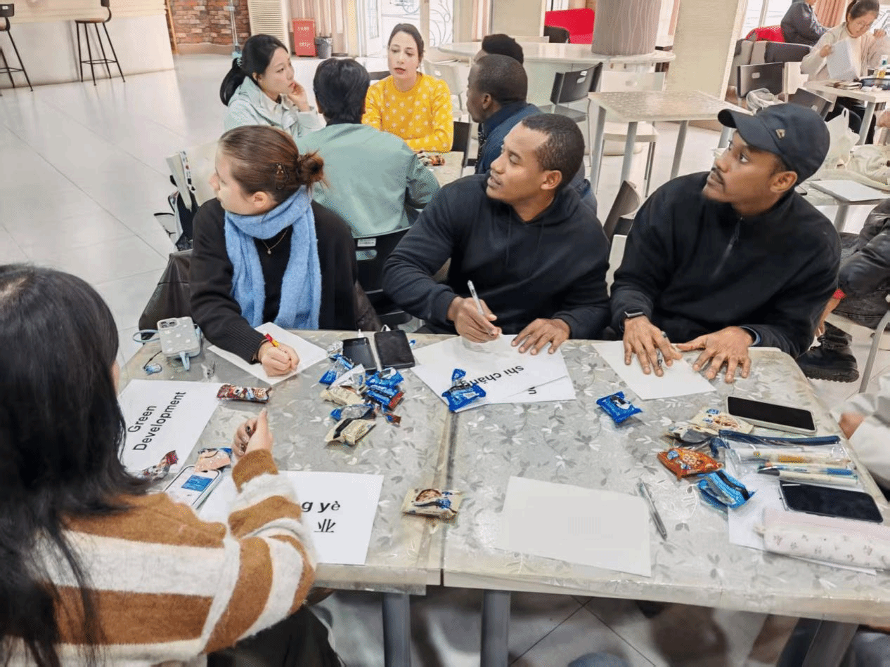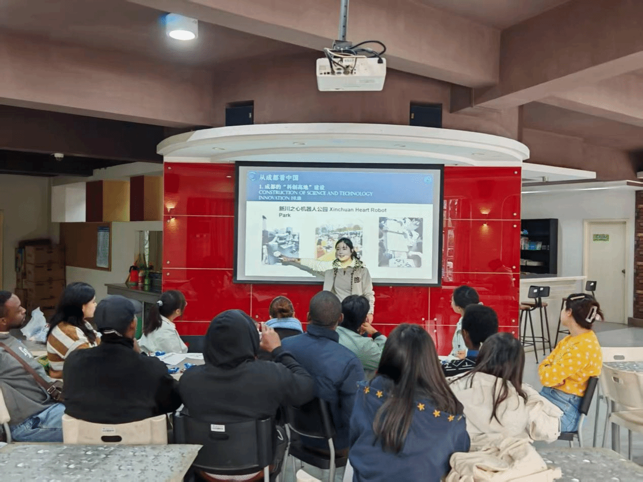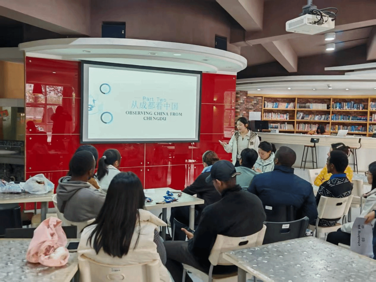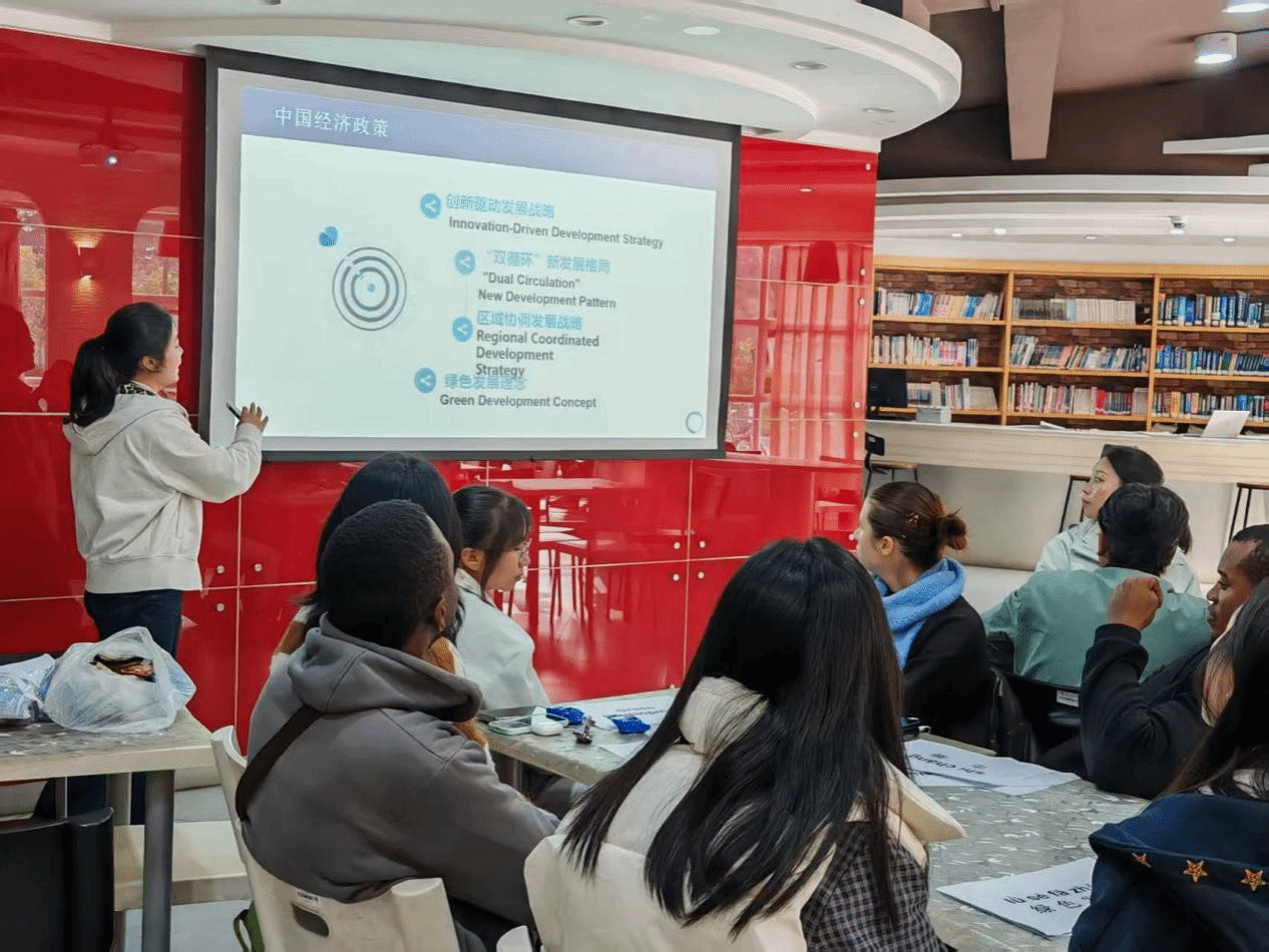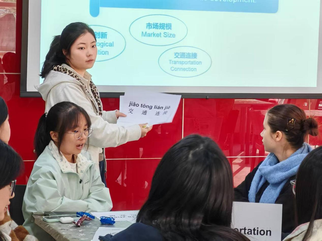 随后,活动视角从全国聚焦至我们生活的城市——成都。主持人以“网红城市”成都为例,深入剖析其独特的发展模式与战略定位。主持人结合具体案例,如“科创高地”、“公园城市”等进行讲解,这引发了留学生的热烈讨论。最后引导留学生找到“创新”“协调”“绿色”等关键词,让其充分领略成都经济发展的多样性与活力。