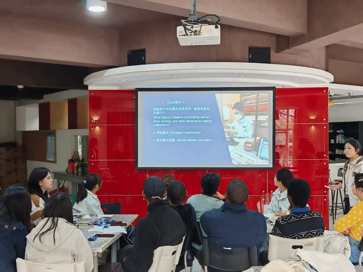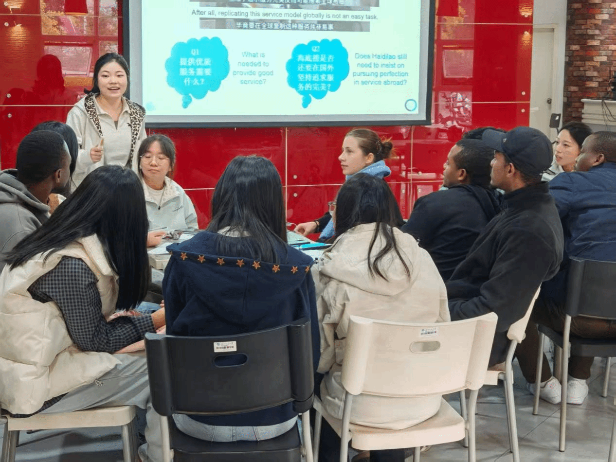 紧接着,活动进入创业案例研讨阶段,以四川知名餐饮品牌“海底捞”的成功之路为样本,解码其从初创到壮大的创业智慧,使抽象的理论知识变得具体可感。项目设计的趣味问答环节不仅加深了留学生对创业案例的认识,也锻炼了留学生的语言能力。
