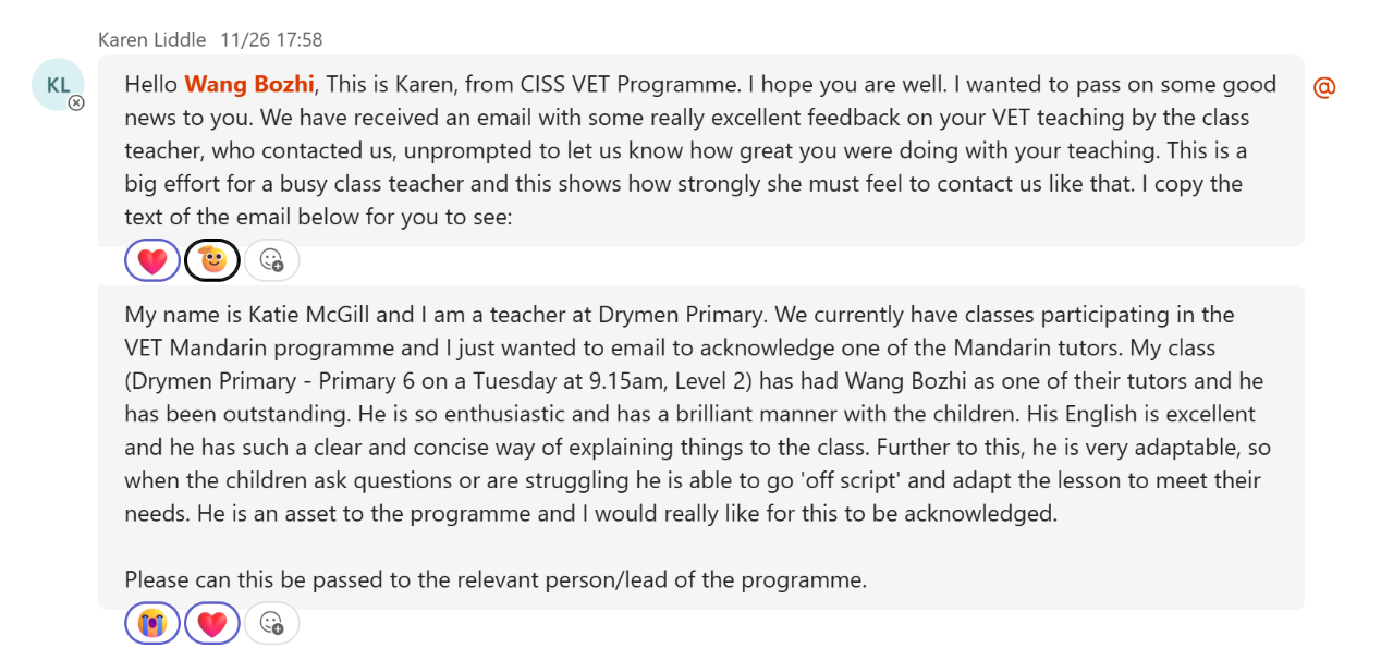 在2025年秋季学期的教学中,VET项目再添亮眼成果。由47位国际汉语系研究生、本科生组成的教师团队,为苏格兰29所中小学、46个班级的1106名学生,开展为期八周的线上中文课程,累计授课334节,教学效果广受好评。其中,25级研究生王渤铚、刘书宁、李梦玥因表现突出,获得英方负责教师特别赞赏。