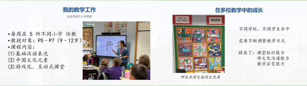 在总结会上,2025年春季外派苏格兰的VET志愿者们分享了教学与生活实践。这批老志愿者曾在线上中文教学岗位上积累了宝贵经验,为外派工作奠定了坚实基础。从线上授课转向线下课堂,他们将远程教学中锻炼的沟通与应变能力,转化为多校教学中的灵活适应力,使中文教学方法体系在传承中真正落地生根。同时,线上教学中传递的文化温度,也随着志愿者的脚步在海外延续:中秋、春节等文化活动的策划思路,从“云分享”转为线下亲手实践,让文化交流更具体验感和温度。从线上到海外,中文教学志愿者以经验为纽带接力前行,不仅让教学方法在传承中不断迭代,也使中文与中华文化的传播纽带更加紧密。